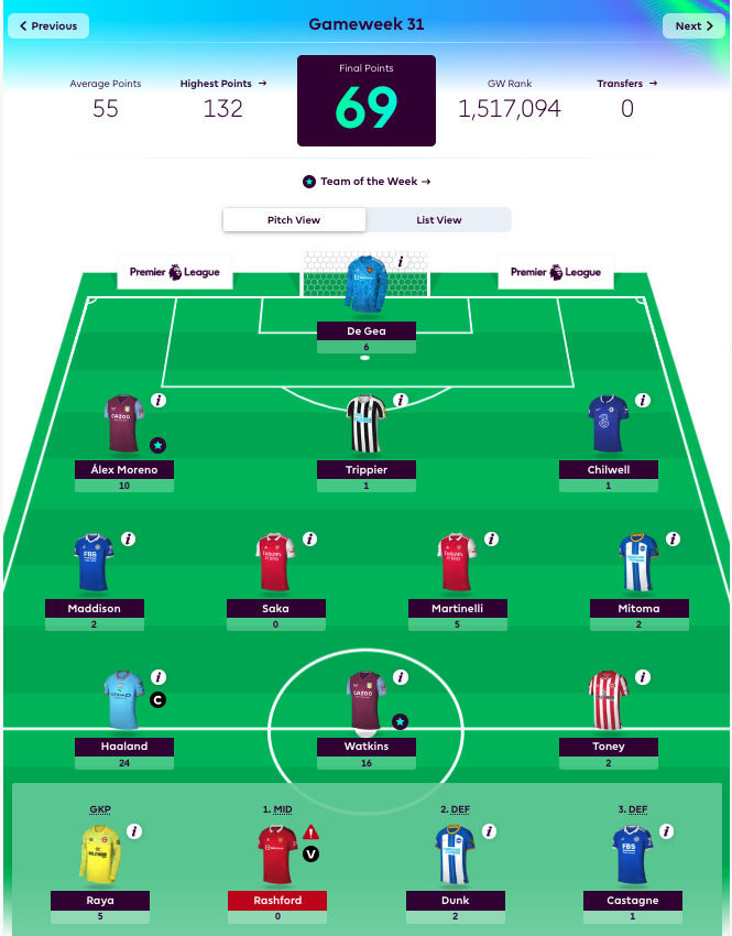 One's to watch- The next week to pin in your diary is GW34. It's time to think about putting out a full starting XI, all with double fixtures. The spine of that team needs to include Alisson, Estupinan, Mitoma/March, Rashford and Haaland. The rest of your team will determine whether you climb or fall and how much you're willing to gamble. Another statistic of note is that Brigthon have 9 fixtures to squeeze into the remaining 6 GWs.